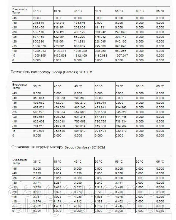 Холодопродуктивність, потужність і споживання струму компресора Secop (Danfoss) ЅС15СМ